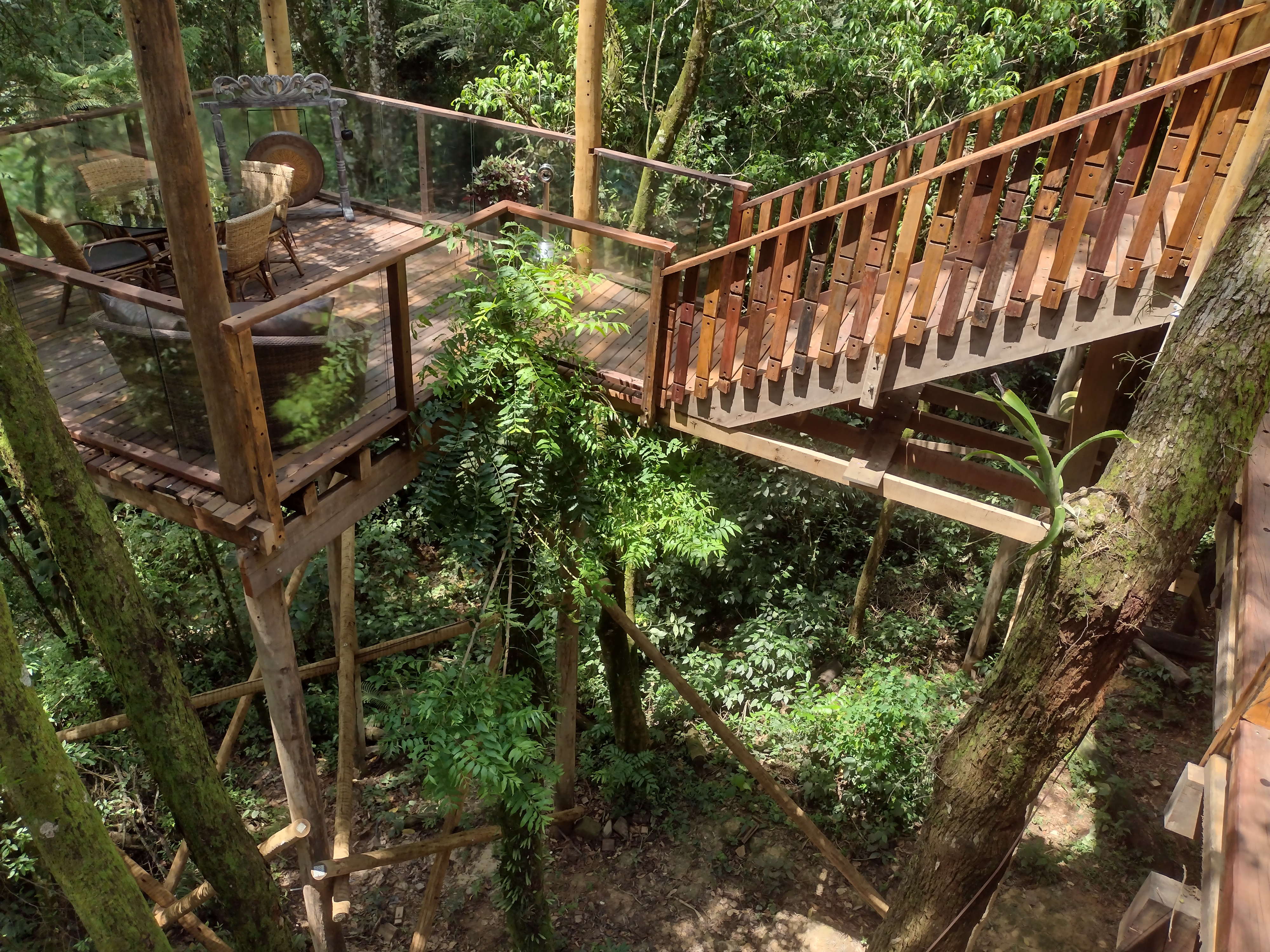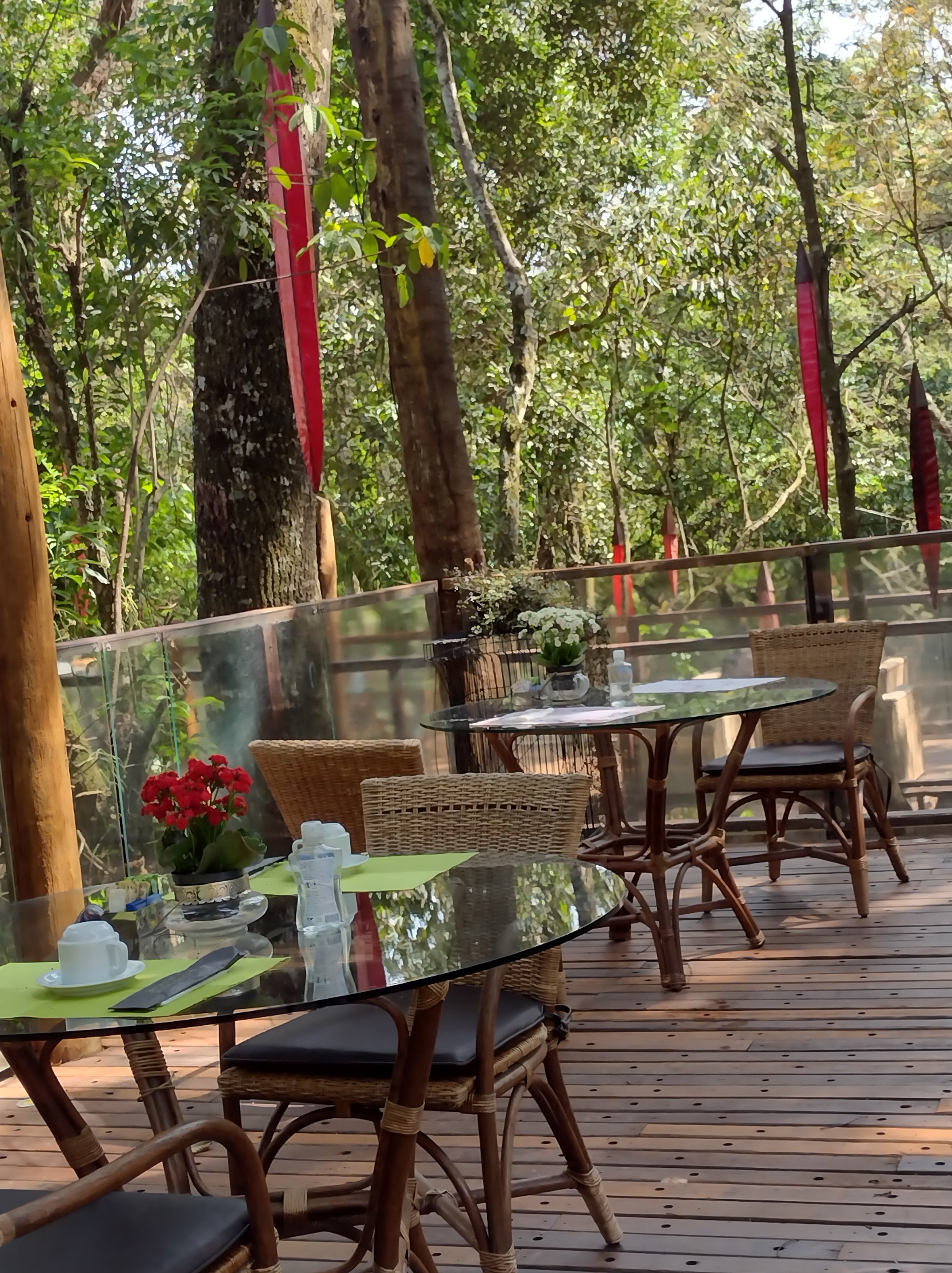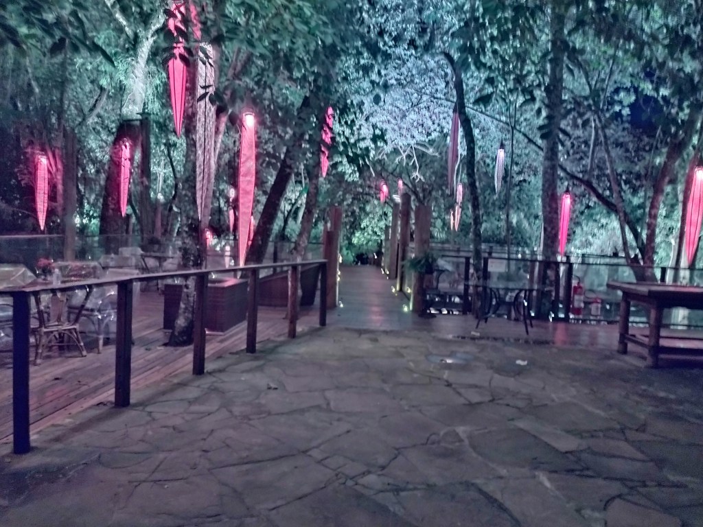 Para refeições, ou apenas para descansar um pouco e curtir a paisagem, tem um deque fantástico entre as árvores, com iluminação noturna e uma linda decoração.